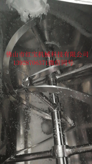 2.攪拌器結構上,螺旋設計成內外,左右互為反螺旋,攪拌器工作時內螺旋帶動靠近軸心處物料做軸心旋轉,軸向由內至兩側推動,外螺旋帶動靠近桶壁物料做軸心旋轉,軸向由兩側至內推動,于是造成物料在桶體內對流循環,攪拌機,剪切滲混,完成物料在較短時間內快速均勻混合。